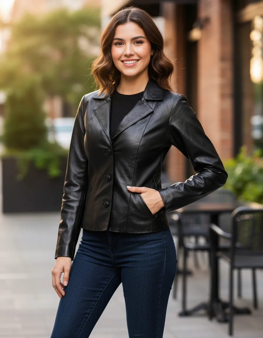 Jaqueta feminina esportiva em couro legítimo bovino. Modelagem ajustada ao corpo feminino, com design elegante e funcional. Ideal para o inverno e para uso em motos.